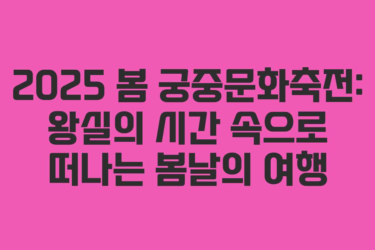 2025 봄 궁중문화축전은 서울의 아름다운 궁궐에서 전통과 현대가 어우러진 특별한 경험을 제공합니다. 과거의 왕실 문화를 현대적으로 재해석한 다양한 프로그램을 통해 모든 세대가 함께 즐길 수 있는 축제가 될 것입니다.